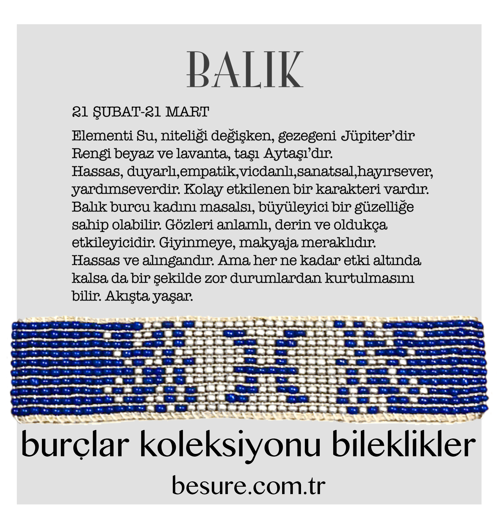 Balık burcu, zodyak kuşağının on ikinci burcudur ve 19 Şubat - 20 Mart tarihleri arasında doğan kişileri kapsar. Duygusallığı, sezgiyi ve yaratıcılığı ile bilinen Balık burcu, su elementinin etkisi altında harmanlanmış duygusal bir yapıya sahiptir. Bu bileklik, Balık burcunun sahip olduğu tüm bu özellikleri temsil eder. Onların sezgi güçlerini arttırırken, ruhsal dinginlik sağlamaya yardımcı olur.