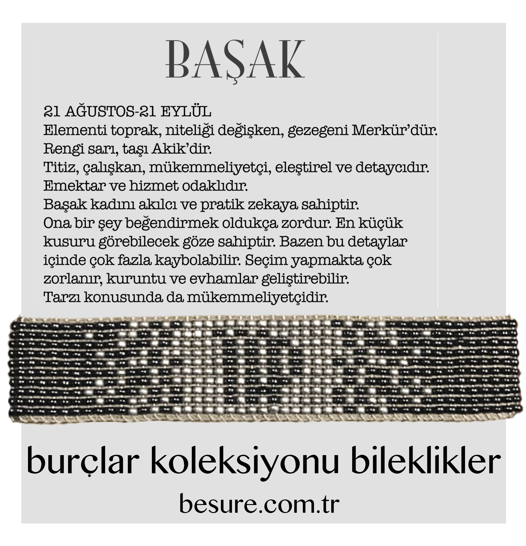 Başak burcu, analitik düşünme yeteneği, sadelik ve mükemmeliyetçilik ile bilinir. Bu bileklik, Başak burcuna ait olan bu özellikleri sembolize eder ve kullanıcısına sürekli bir motivasyon kaynağı sağlar. Detaylara verilen önem, kişisel stilinize ve yaşamınıza derinlik katar.