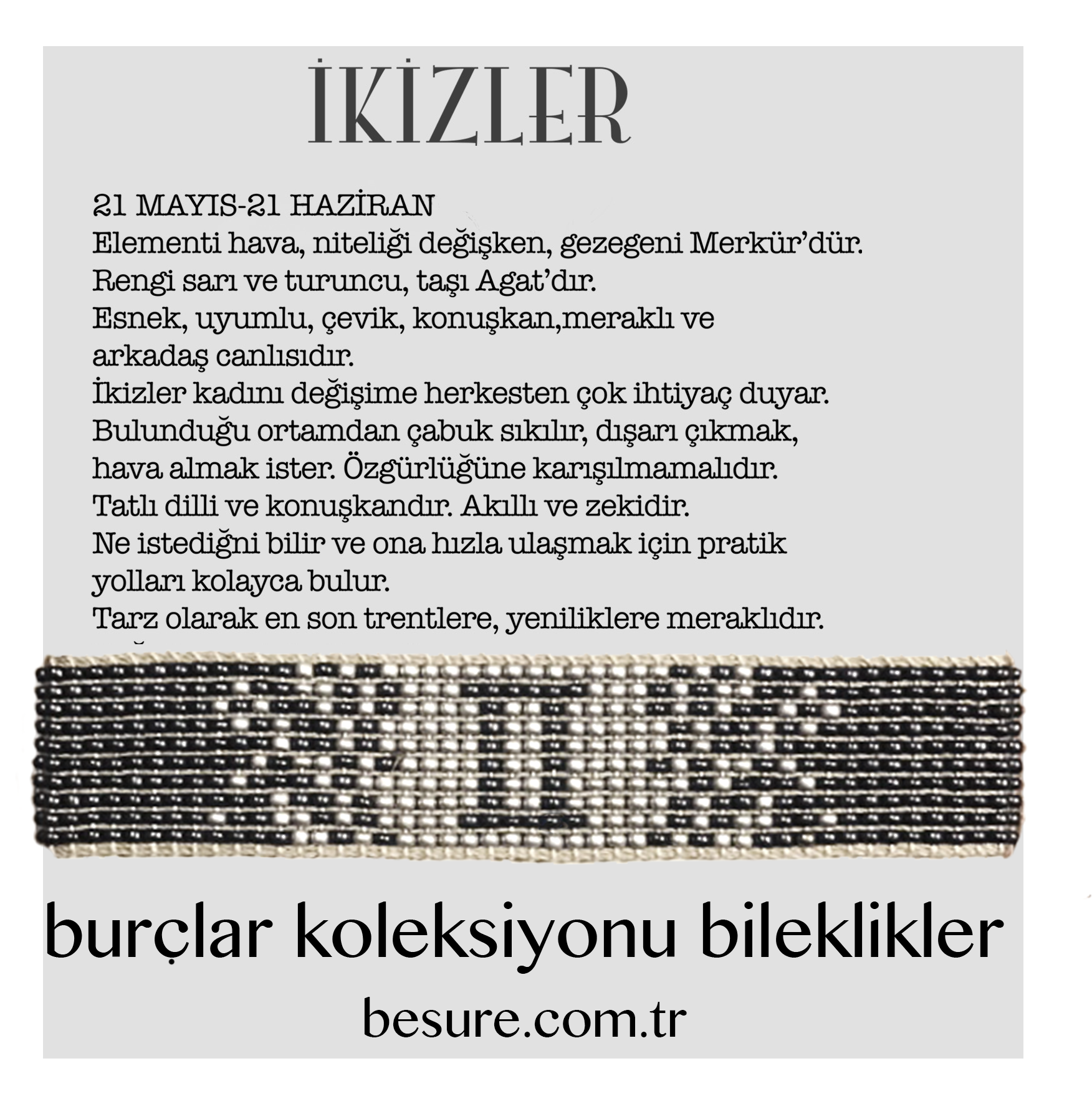İkizler, değişken bir hava burcudur ve bu nedenle çok yönlülükleri ile tanınırlar. Zeki ve analitik bir yapıya sahip olan İkizler, aynı zamanda iletişim yetenekleri ile de ön plandadır. Yeni bilgi ve deneyimlere açık olan bu burç mensupları, sosyal çevrelerinde arkadaş canlısı ve eğlenceli bir kişilik sergilerler. Bu bileklik, onların dinamik doğasını yansıtan bir aksesuar olarak tasarlanmıştır.