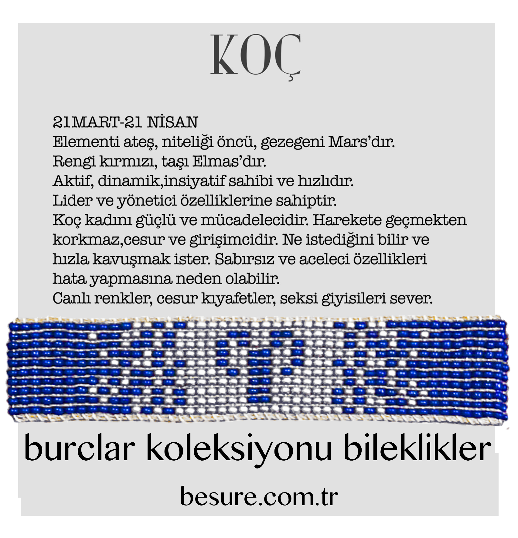 Koç burcu bireylerinin enerjisini ve tutkusunu yansıtan mavi bilekliklerimiz, sadece şıklığıyla değil, aynı zamanda anlamıyla da kalpleri fethediyor. 21 Mart - 19 Nisan tarihleri arasında doğan Koç burçları için özel olarak tasarlanmış bu bileklikler, hem günlük kullanımda şıklığı sağlarken hem de burçlarının özelliklerini vurguluyor.