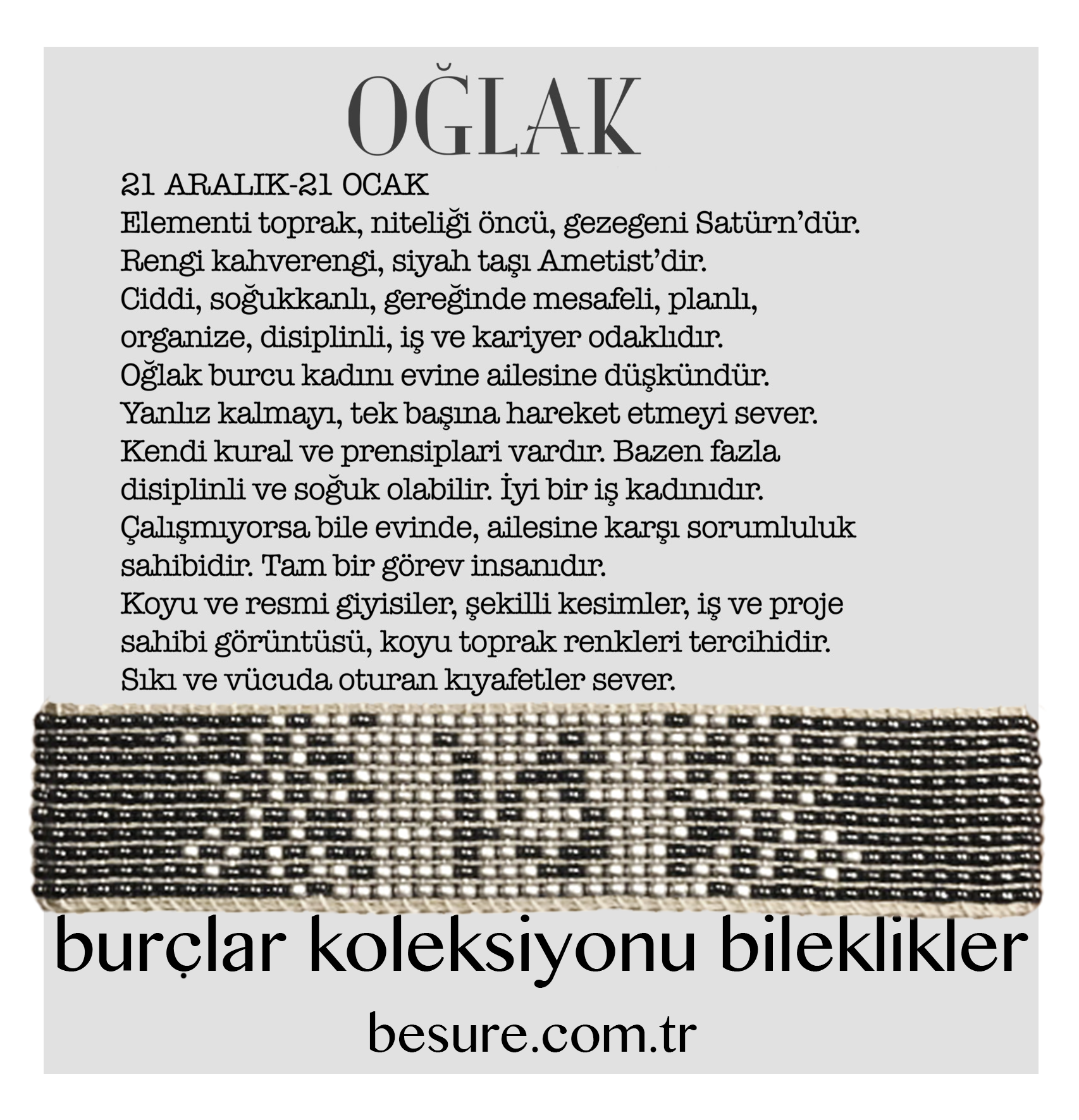 Oğlak Bileklik Antra, yüksek kaliteli malzemelerden üretilmiştir. Özel tasarımlı detayları ve dayanıklı yapısıyla uzun ömürlü bir kullanım sunar. Antrasit rengi, her türlü kıyafetle rahatça kombinlenebilmesi için tasarlanmıştır. Farklı stillere uyum sağlama yeteneği ile, hem klasik hem de modern moda anlayışını yansıtır.